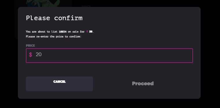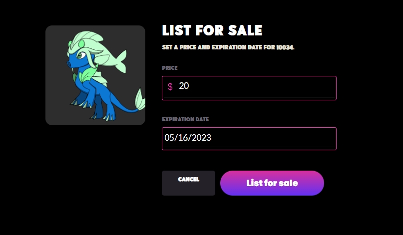 Set an expiration date and price for the Kryptomon (Price will be set in $ and automatically converted and listed in KMON)