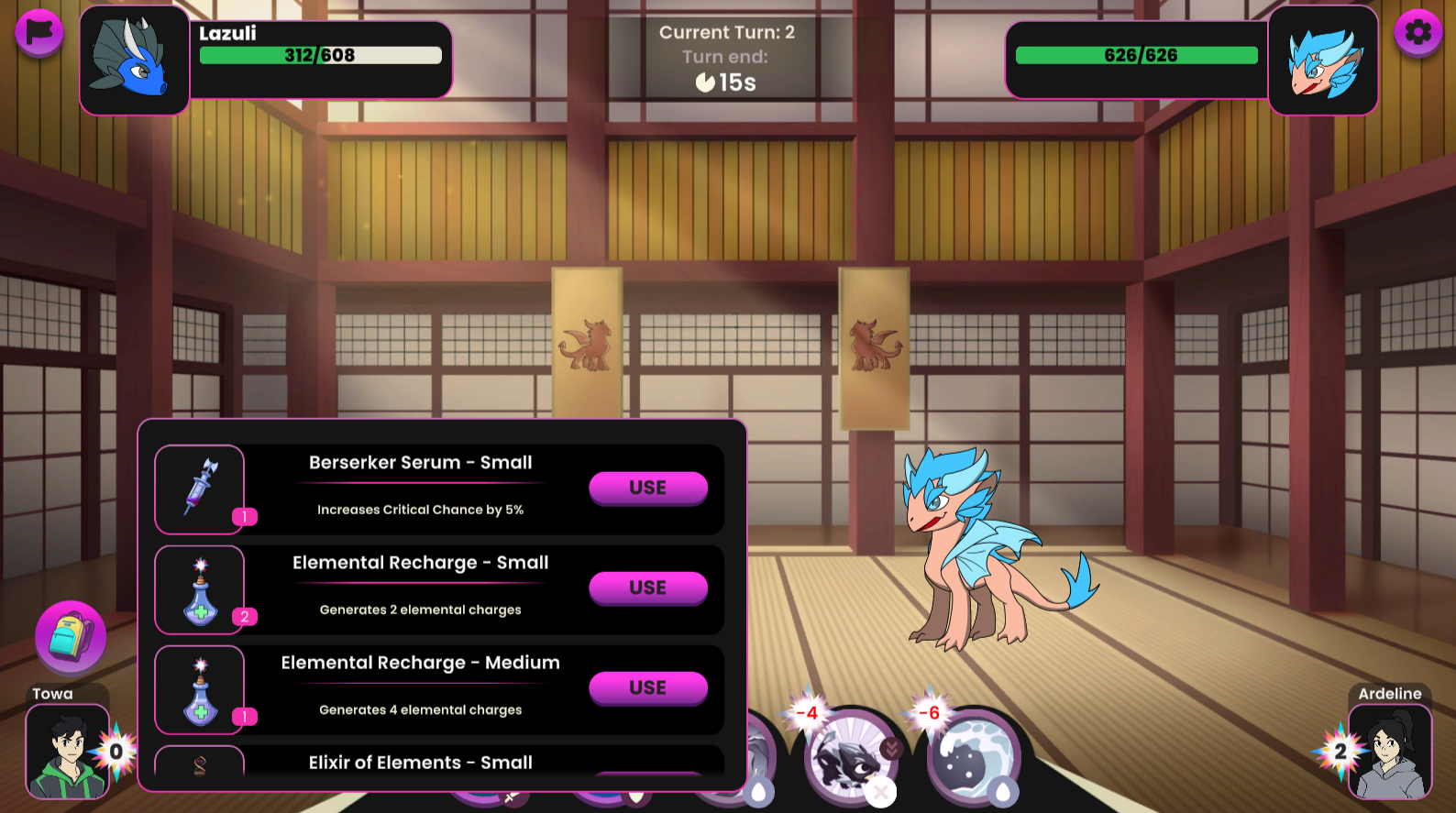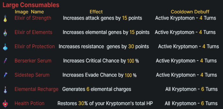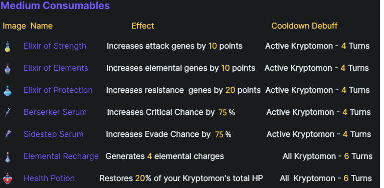 \ <mark style="color:yellow;">All effects last 4 turns (excluding Elemental Recharge,Health Potion,Critical and Evade Serum)</mark>&#x20;