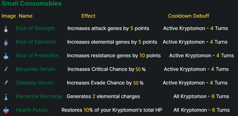 Upon using an item, your Kryptomon will gain a <mark style="color:yellow;">debuff restricting it from using another item for a</mark> set amount of turns depending on the items strength. Some items are so powerful that the debuff will affect <mark style="color:yellow;">every Kryptomon on your team</mark> <mark style="color:yellow;">preventing item usage on all pets</mark> for a set amount of turns.&#x20;