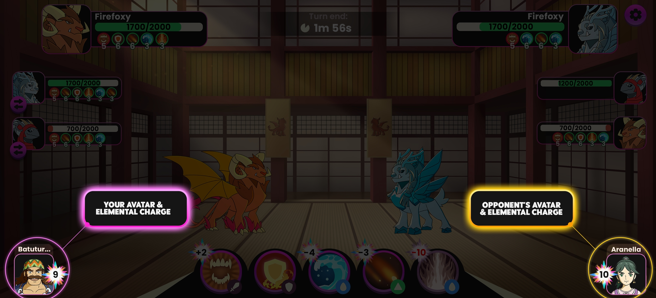 Finally in the bottom left, you'll see your trainer avatar along with the number of elemental charges you've accumulated. Elemntal charges are used to cast stronger spells. It good to keep track of how many spells both you and your opponent have so you can predict their next move!