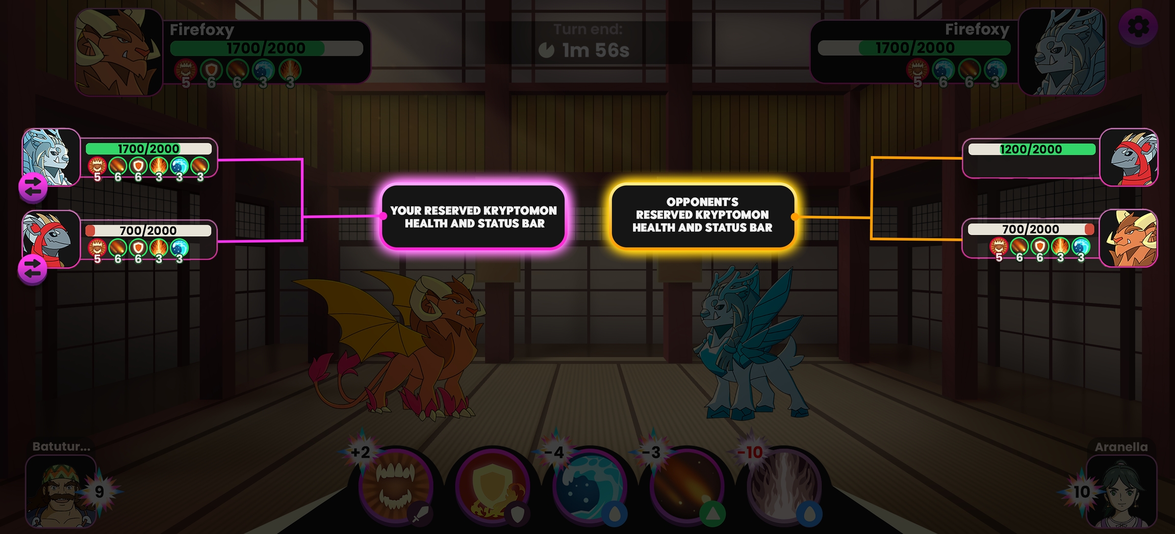 Before battle, each trainer will choose to field up to 3 Kryptomon. Since Kryptomon battles are 1v1, you'll also determine which of your 3 Kryptomons will enter battle first.
