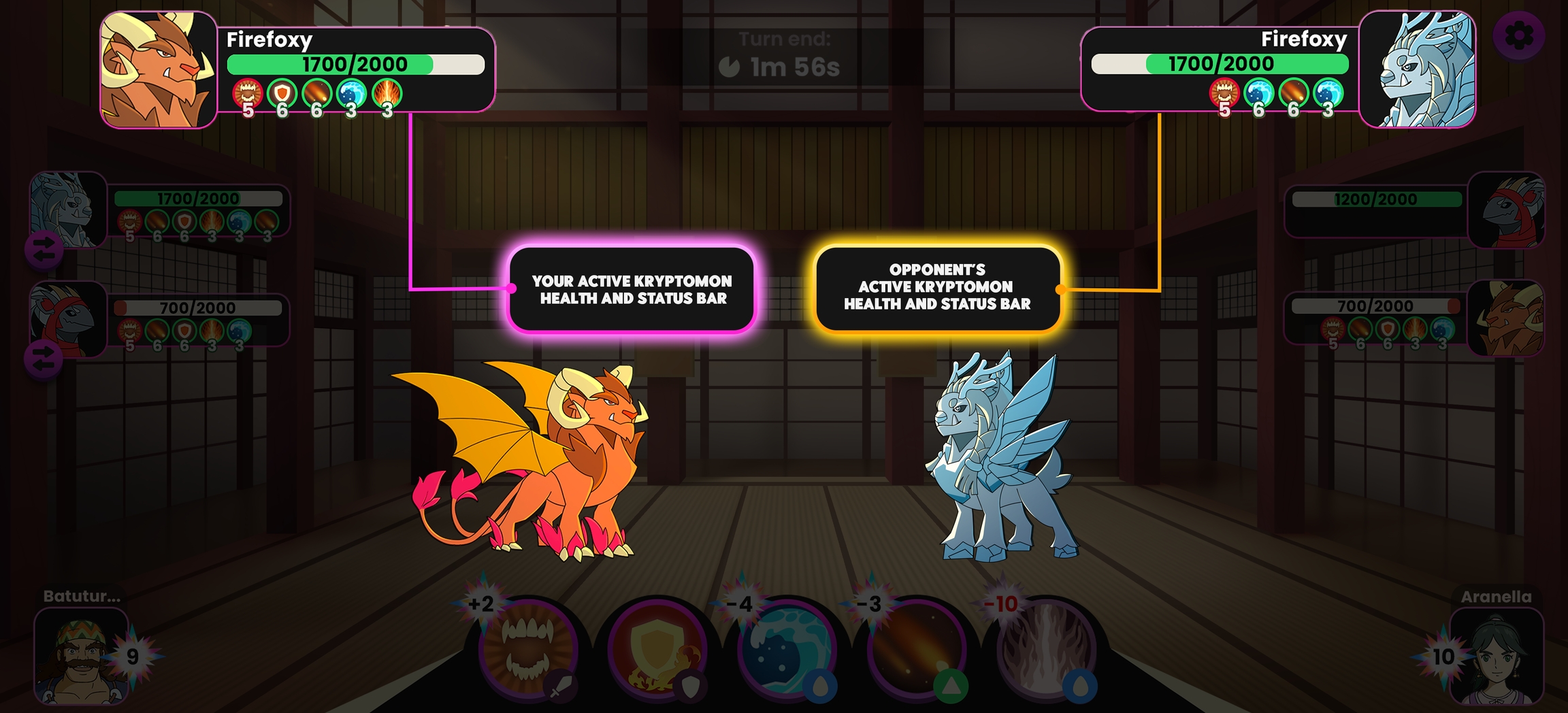 During battle, the left side of the screen will show information related to your Kryptomon team, while similar information on the opponent's team is available on the right.