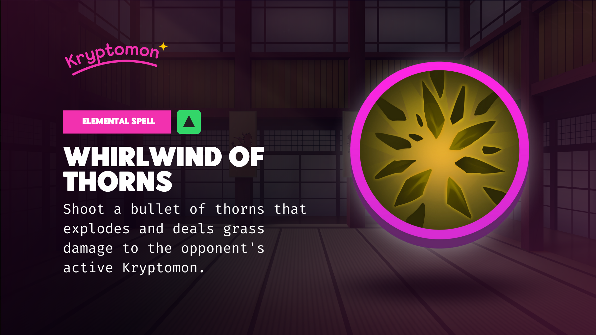 <mark style="color:purple;">Elemental spell</mark> unlocked at level 0. <mark style="color:yellow;">Costs 2 charges</mark> and deals elemental damage based on your Kryptomons <mark style="color:yellow;">Grass Elemental Stat</mark> (Genes \* Talent) vs the defending Kryptomons <mark style="color:yellow;">resistance and crazy.</mark> &#x20;