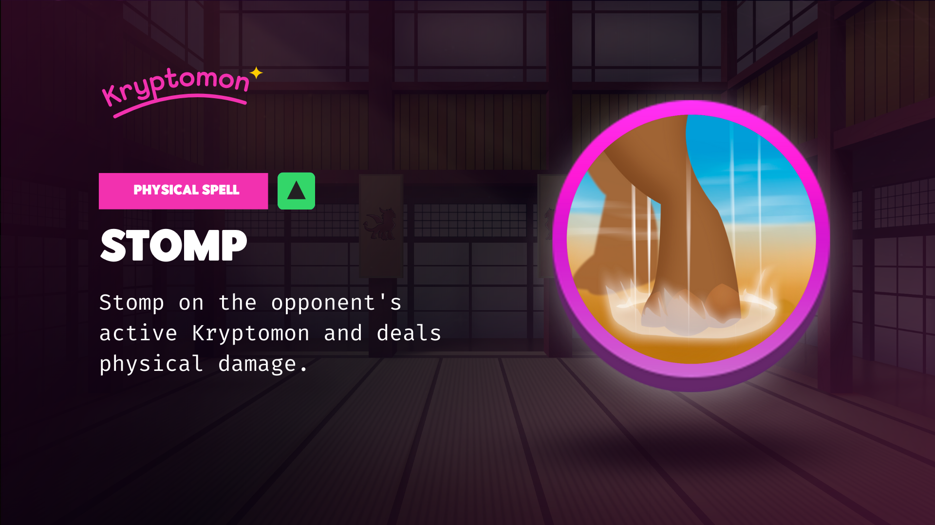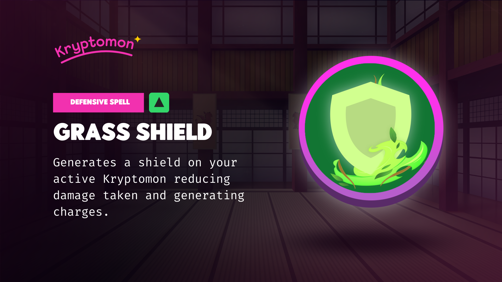 <mark style="color:red;">Defensive spell</mark> unlocked at level 30. Applies a buff to the active Kryptomon that <mark style="color:yellow;">reduces damage taken by 60% for the next 2 turns.</mark> This spells has an <mark style="color:yellow;">8</mark> turn cooldown<mark style="color:yellow;">.</mark>&#x20;