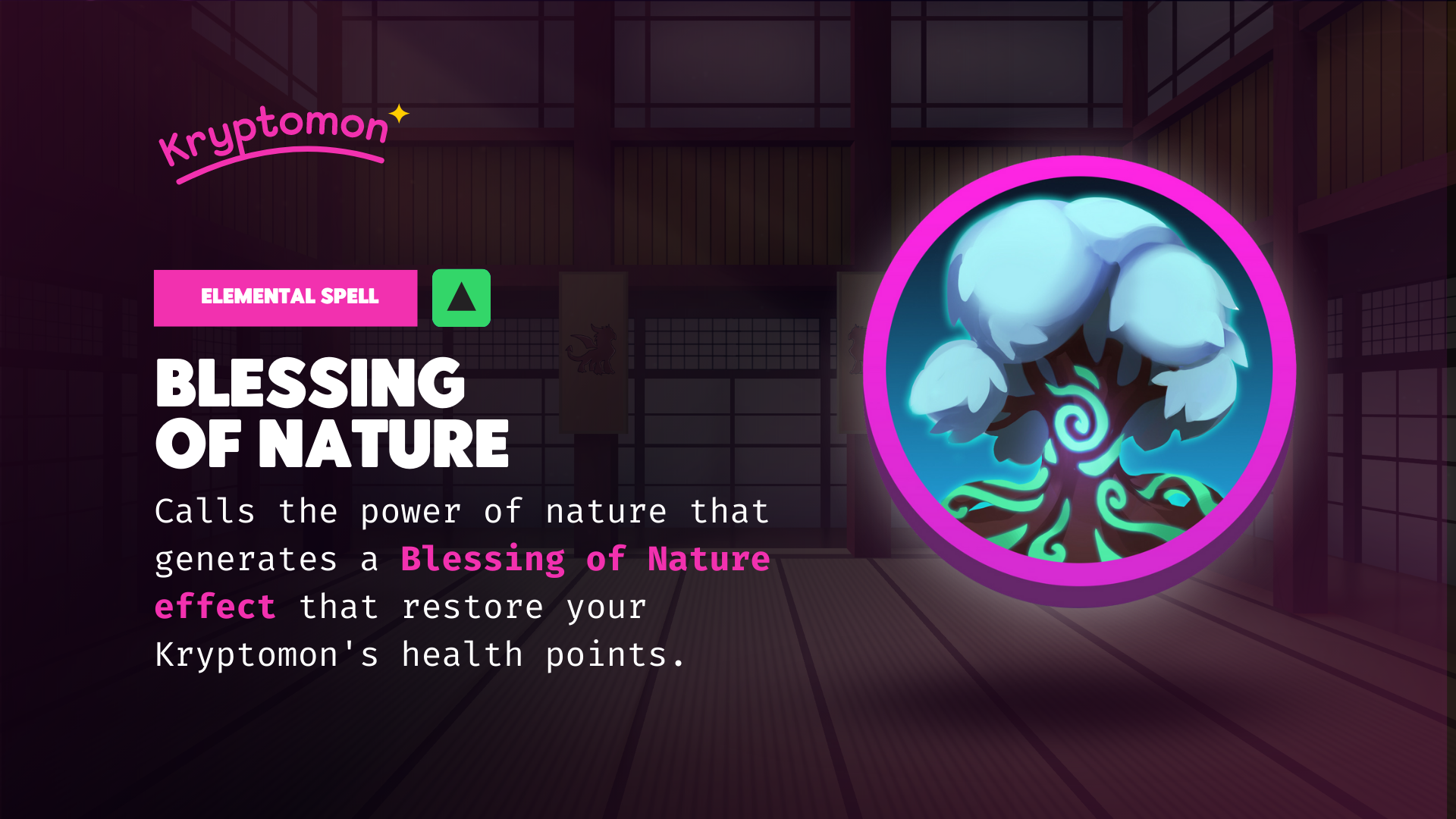 <mark style="color:purple;">Elemental spell</mark> unlocked at level 8<mark style="color:yellow;">. Costs 2 charges</mark> and heals the active Kryptomon. Heal amount is based on your Kryptomons <mark style="color:yellow;">Grass Elemental Stat</mark> (Genes \* Talent) (6 turn cooldown)
