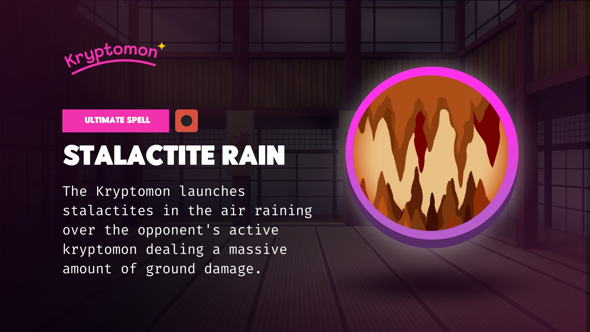Ultimate spell unlocked at level 2. Costs 6 charges and deals huge elemental damage based on your Kryptomons Ground Elemental Stat (Genes * Talent) vs the defending Kryptomons resistance and crazy. This attack can not be evaded.