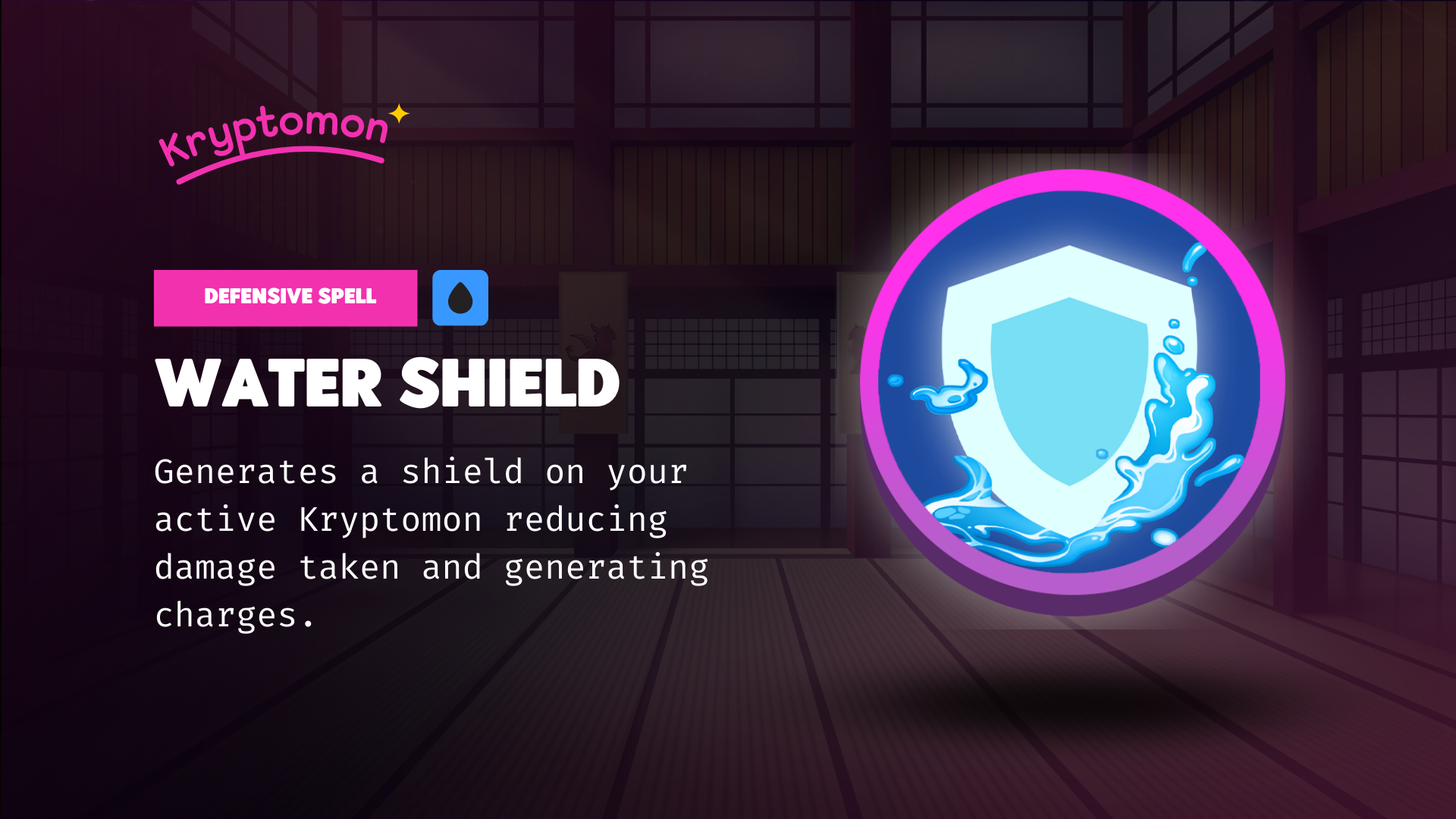 <mark style="color:red;">Defensive spell</mark> unlocked at level 30. Applies a buff to the active Kryptomon that <mark style="color:yellow;">reduces damage taken by 60% for the next 2 turns.</mark> This spells has an <mark style="color:yellow;">8</mark> turn cooldown<mark style="color:yellow;">.</mark>&#x20;
