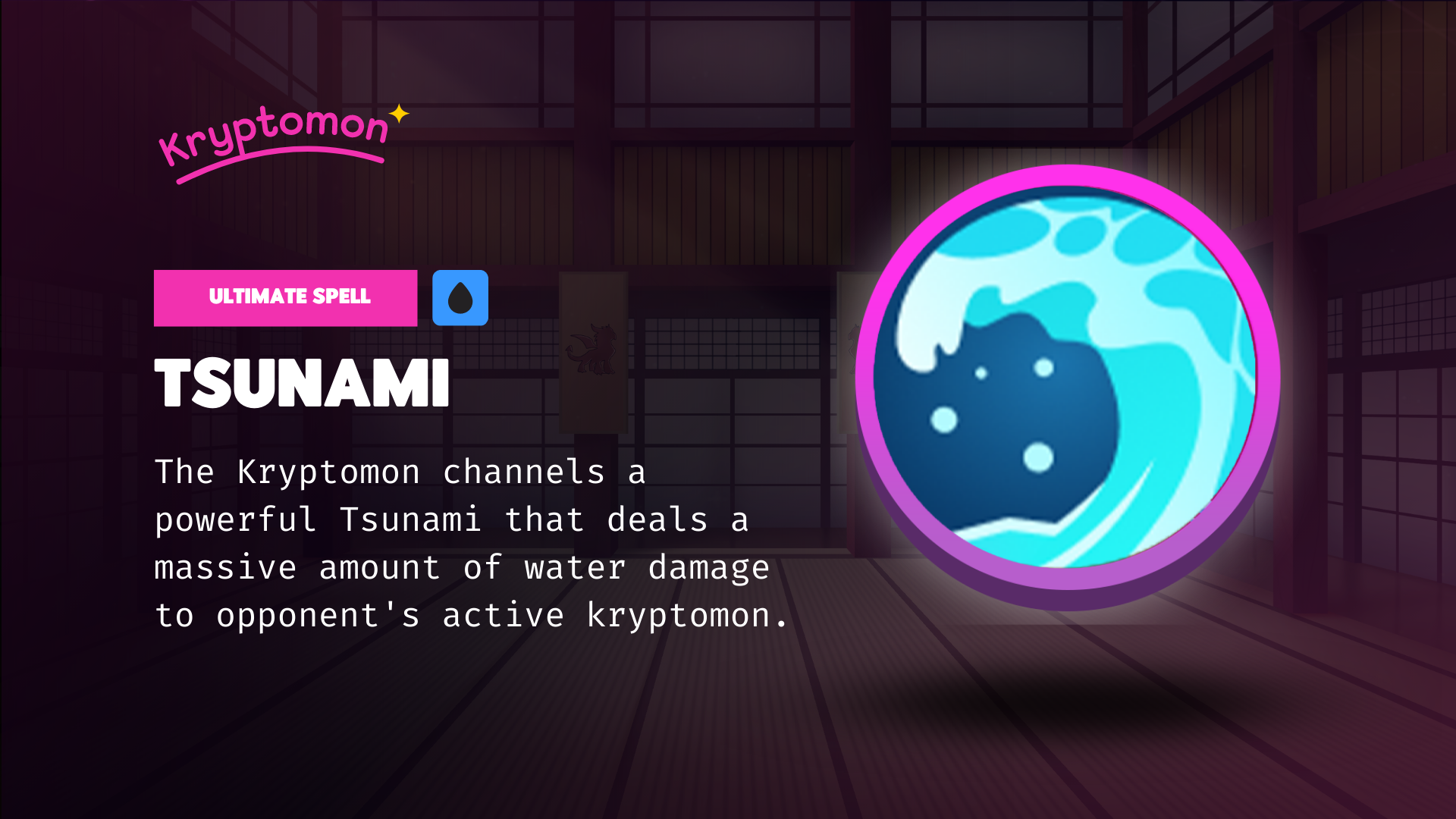 <mark style="color:green;">Ultimate spell</mark> unlocked at level 2. <mark style="color:yellow;">Costs 6 charges</mark> and deals huge elemental damage based on your Kryptomons <mark style="color:yellow;">Water Elemental Stat</mark> (Genes \* Talent) vs the defending Kryptomons <mark style="color:yellow;">resistance and crazy</mark>. This attack <mark style="color:yellow;">can not</mark> <mark style="color:yellow;">be evaded</mark>.
