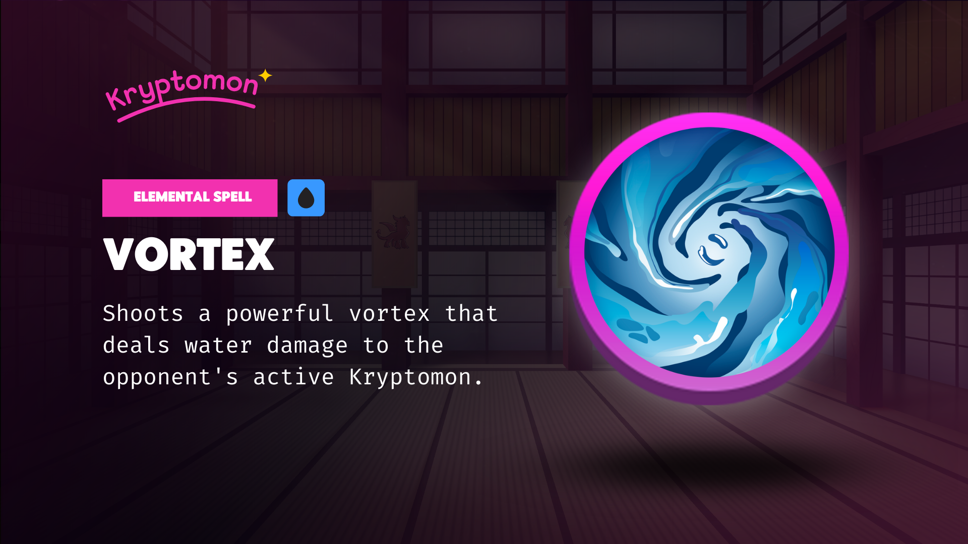 <mark style="color:purple;">Elemental spell</mark> unlocked at level 0. <mark style="color:yellow;">Costs 2 charges</mark> and deals elemental damage based on your Kryptomons <mark style="color:yellow;">Water Elemental Stat</mark> (Genes \* Talent) vs the defending Kryptomons <mark style="color:yellow;">resistance and crazy.</mark>&#x20;
