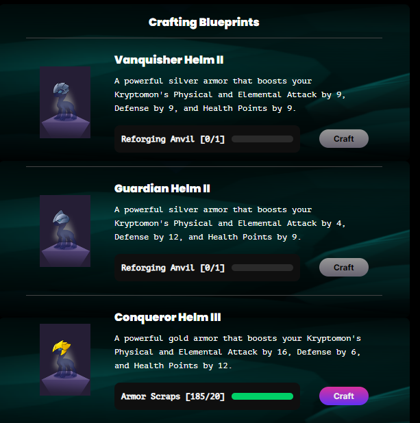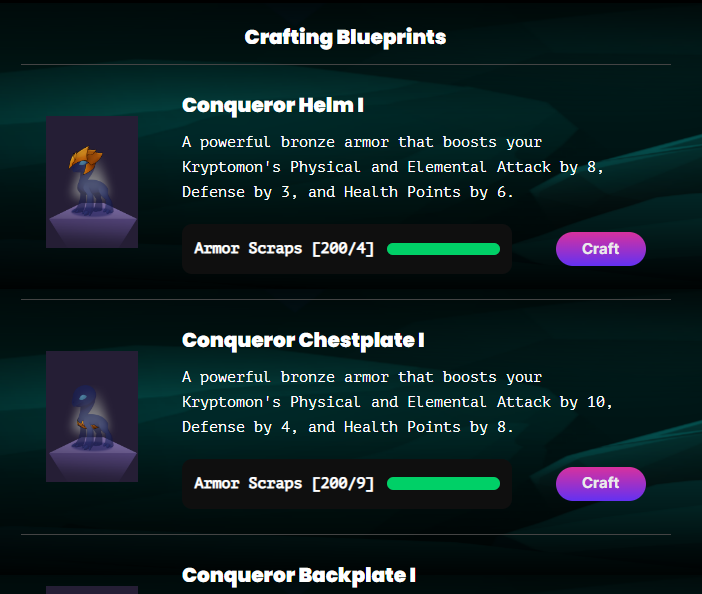Similar to Power Ups, Armors are a craftable and upgradable NFT which boost your Kryptomons strength! Players will be able to craft and upgrade armor with Armor Scraps earned through story mode! Specifics on Armor Scraps, Types of Armor, and Crafting will be covered in the rest of this page!
