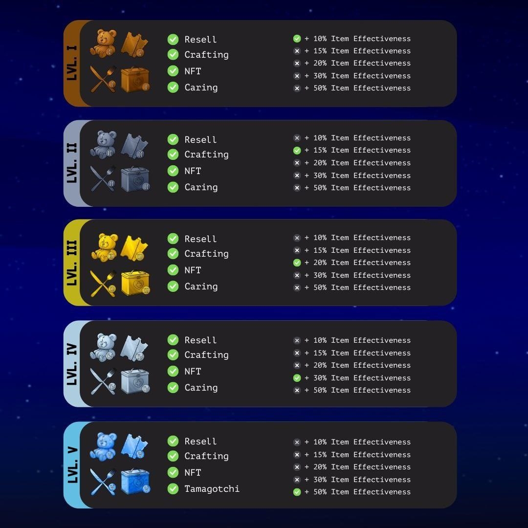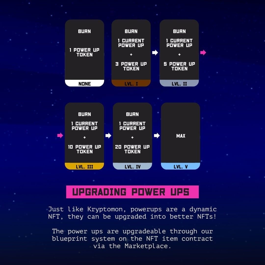 Once you have a Bronze (Level 1) Power Up, you will have the option to level up that NFT by infusing it with more tokens! Each level will increase the effectiveness of the items in the respective category by the following %: Level 1 (Bronze) : 10% Boost Burned (Cost) - 1 Token Level 2 (Silver) : 15% Boost Burned (Cost) - 3 Tokens + Bronze Power Up Level 3 (Gold) : 20% Boost Burned (Cost) - 5 Tokens + Silver Power Up Level 4 (Platinum) : 30%Boost Burned (Cost) - 10 Tokens + Gold Power Up Level 5 (Diamond) : 50% Boost Burned (Cost) - 20 Tokens + Platinum Power Up Players can upgrade their NFTs by going to the marketplace and selecting the Power Up they wish to upgrade and infusing it with the cost mentioned above! There are no fees besides the standard blockchain gas fee!