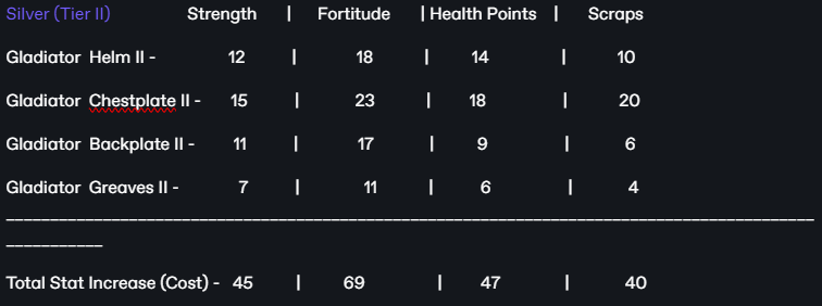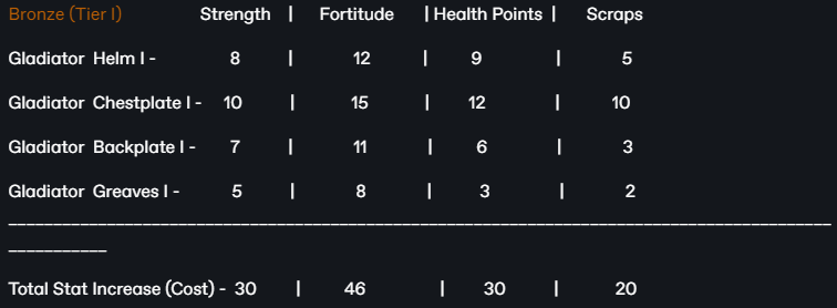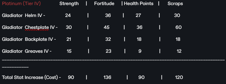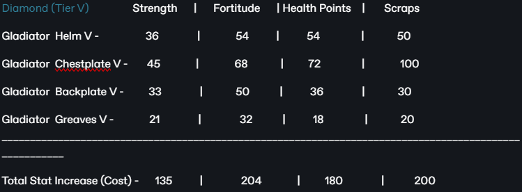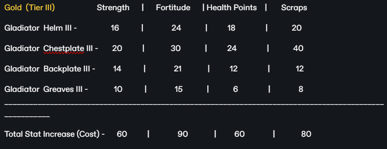 ## Gladiator PVP Armor Stats and Scrap Cost&#x20;