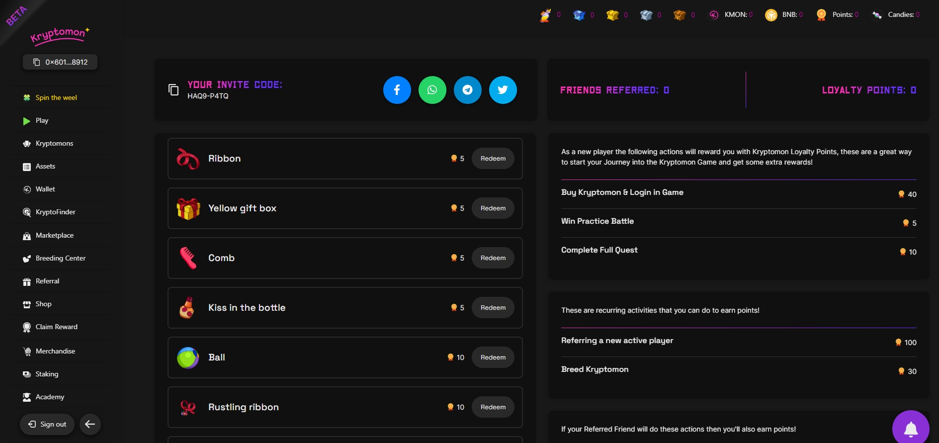 Need an extra steak or tea to finish a quest? By inviting friends to play Kryptomon, you can earn loyalty points which can be redeemed for specific premium items! This allows you to target an item you need and trade in loyalty points instead of KMON!